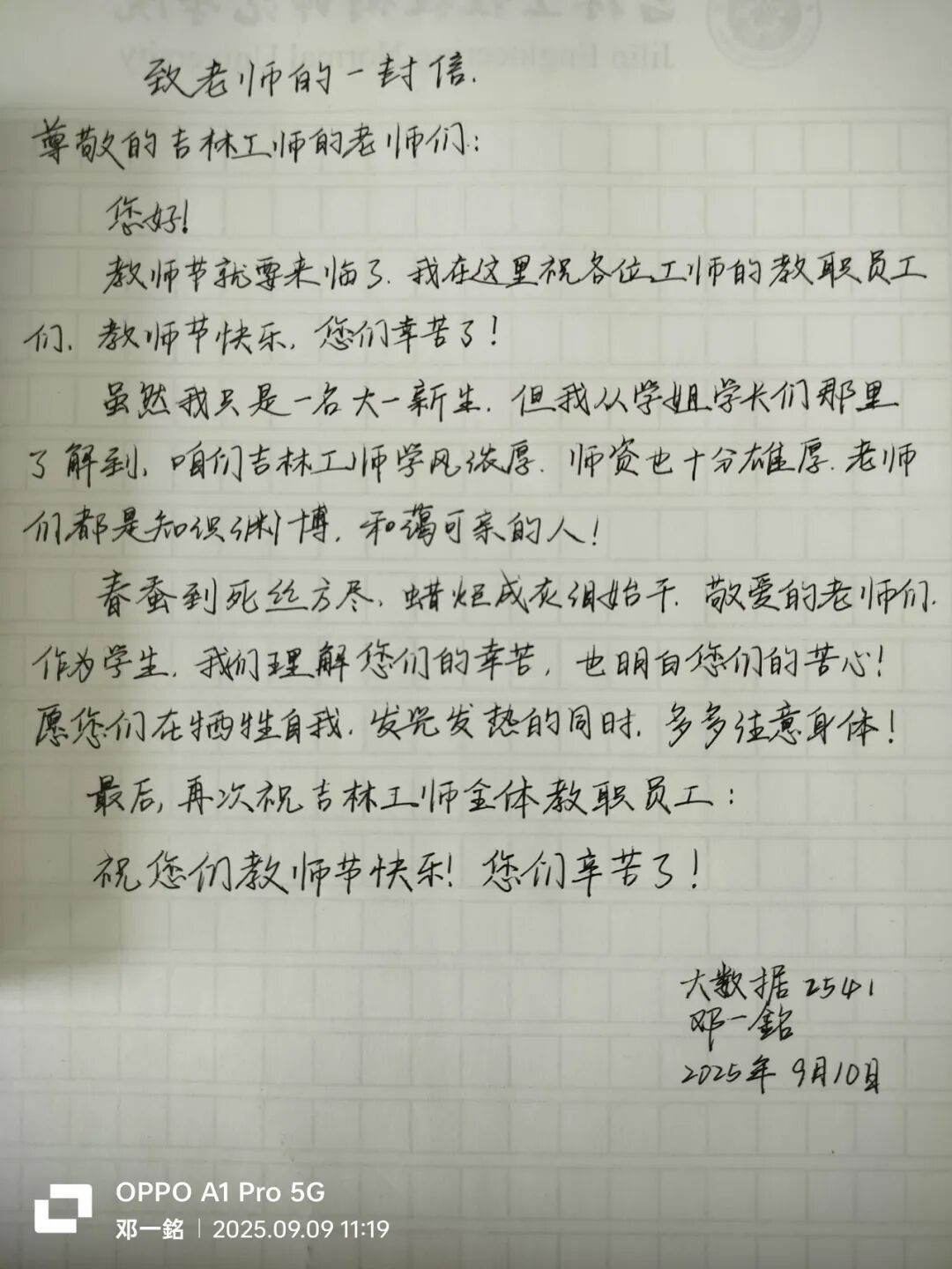这是大数据 2541 班邓一銘同学,在教师节即将到来之时,怀着诚挚的心意写下的给学校老师们的信。信中不仅送上了教师节的祝福,还表达了对学校学风与师资的认可,以及对老师们的理解与关心,字里行间满是对老师们的敬意与感恩。