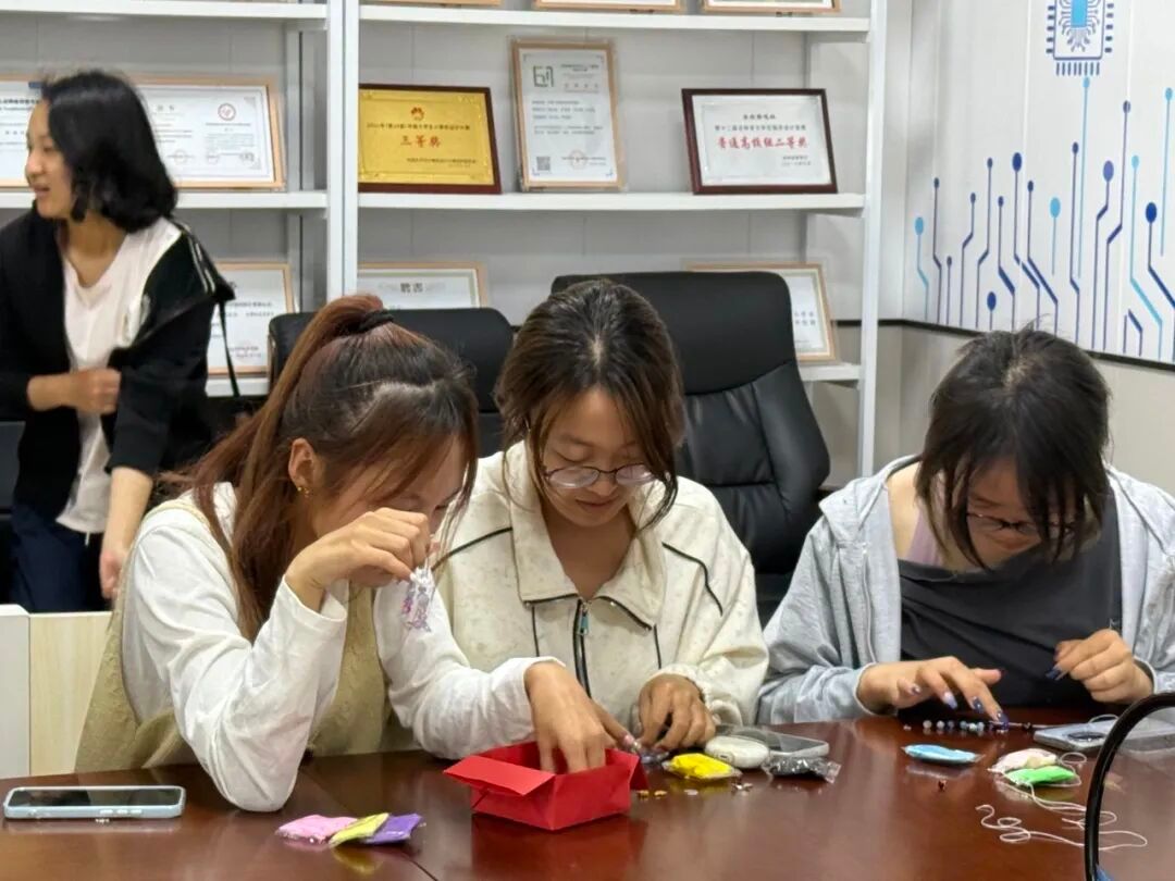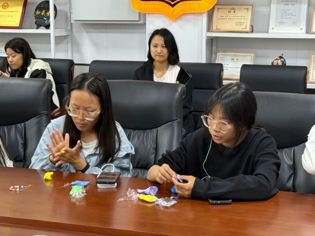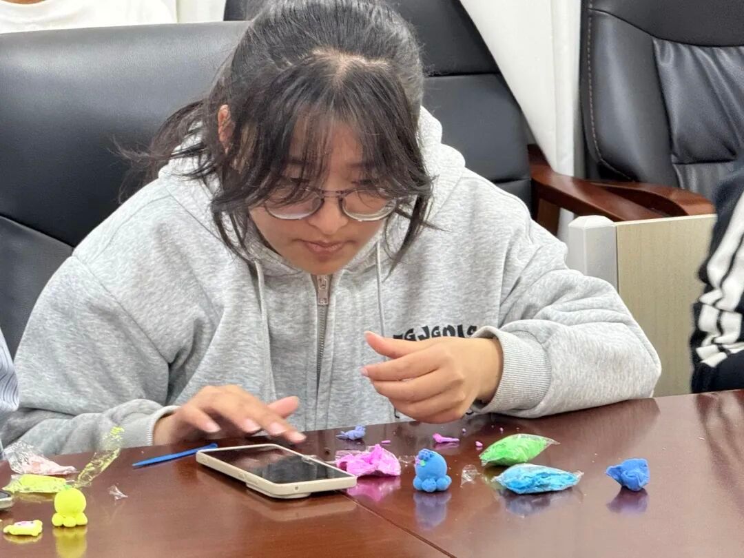 为了让同学们能充分释放情绪、尽情发挥创意,主办方为每位参与者准备了三色粘土套装和百余款珠子配饰。同学们通过捏制粘土、串制手链等形式,将内心的情绪与创意具象化。现场氛围温馨专注,大家在动手实践中逐渐放松身心,彼此的交流也因创意的碰撞而愈发融洽。