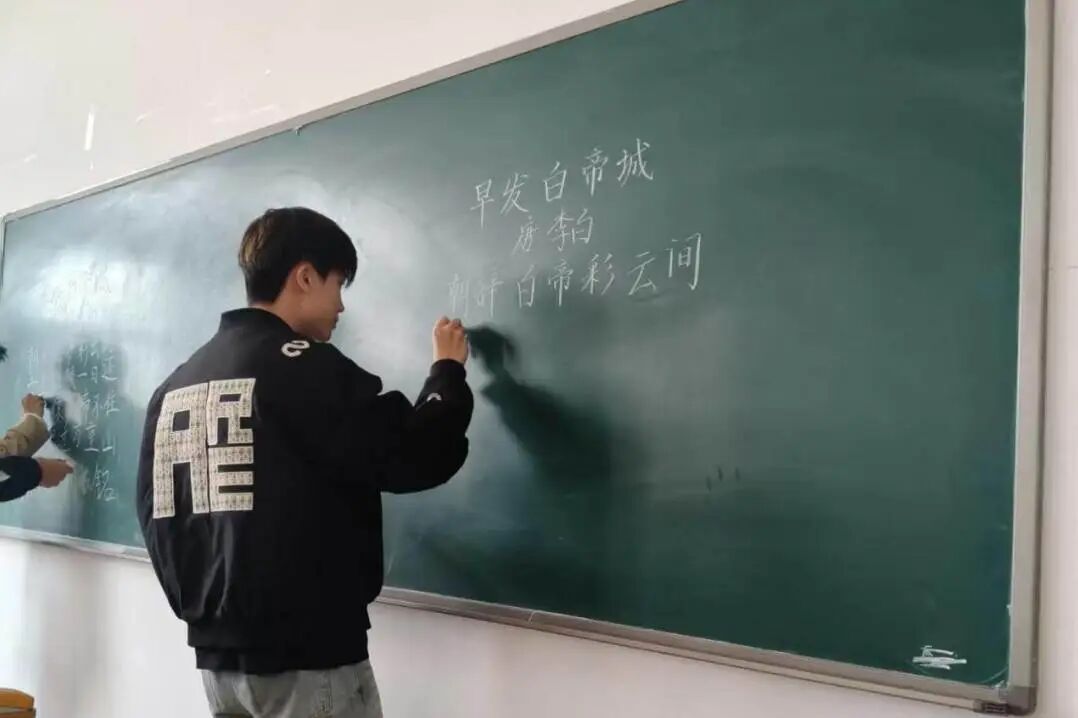 书法大赛|笔落千秋展风采 文载华夏传魅力 来源:学团动态 2025/10/31 10月29日,学院在数智楼416举办“笔落千秋,文载华夏”为主题的书法比赛。活动由学生会学习部统筹组织。赛场紧张却井然有序,选手们专注投入,纸上笔尖沙沙作响,凭借过硬的书法功底与稳定心态,按时完成《早发白帝城》的书写任务。进入决赛的15位选手站姿笔直,握粉笔的手稳定从容,运笔间,黑板上慢慢显露出或清秀雅致、或遒劲有力的字迹,圆满完成书写任务。经过多轮紧张激烈的角逐,评委从字迹、章法等维度综合评定,最终选出五名表现突出的同学,代表学院参加“第五届‘工师杯’大学生师能大赛”。