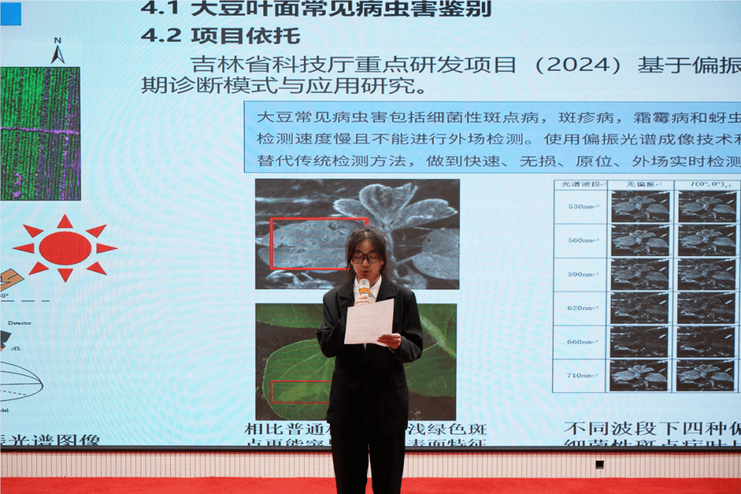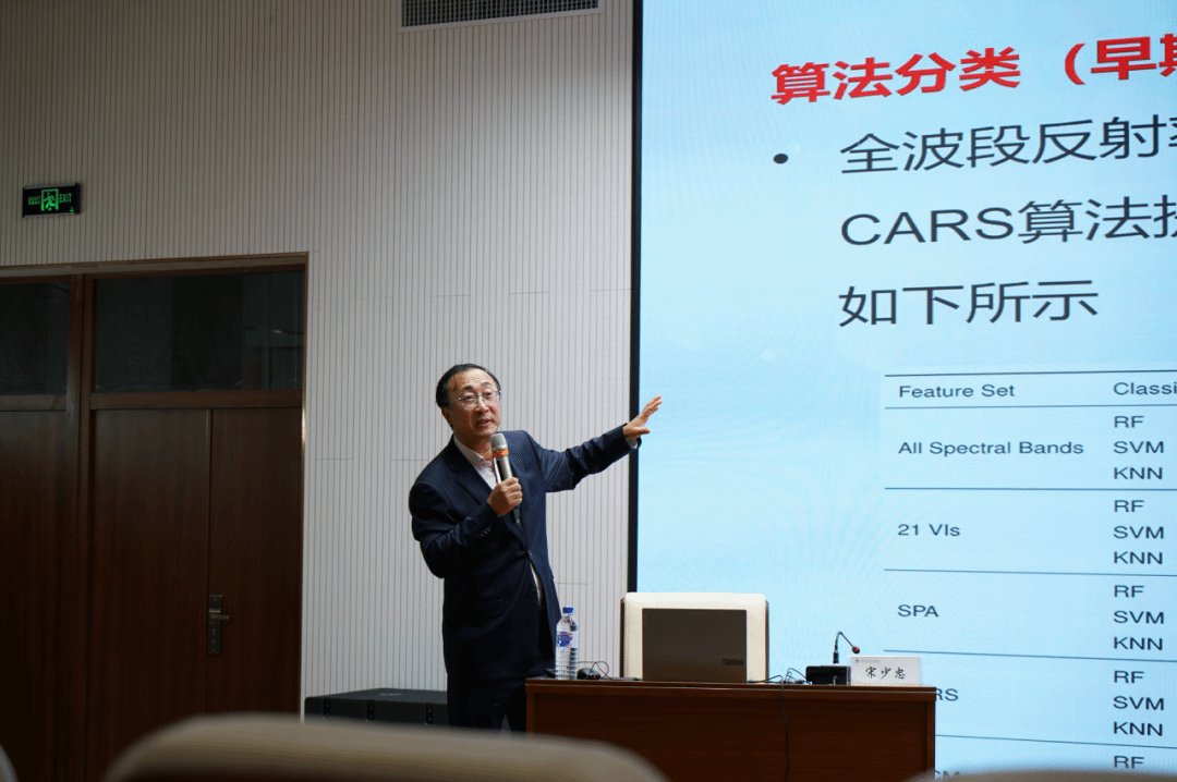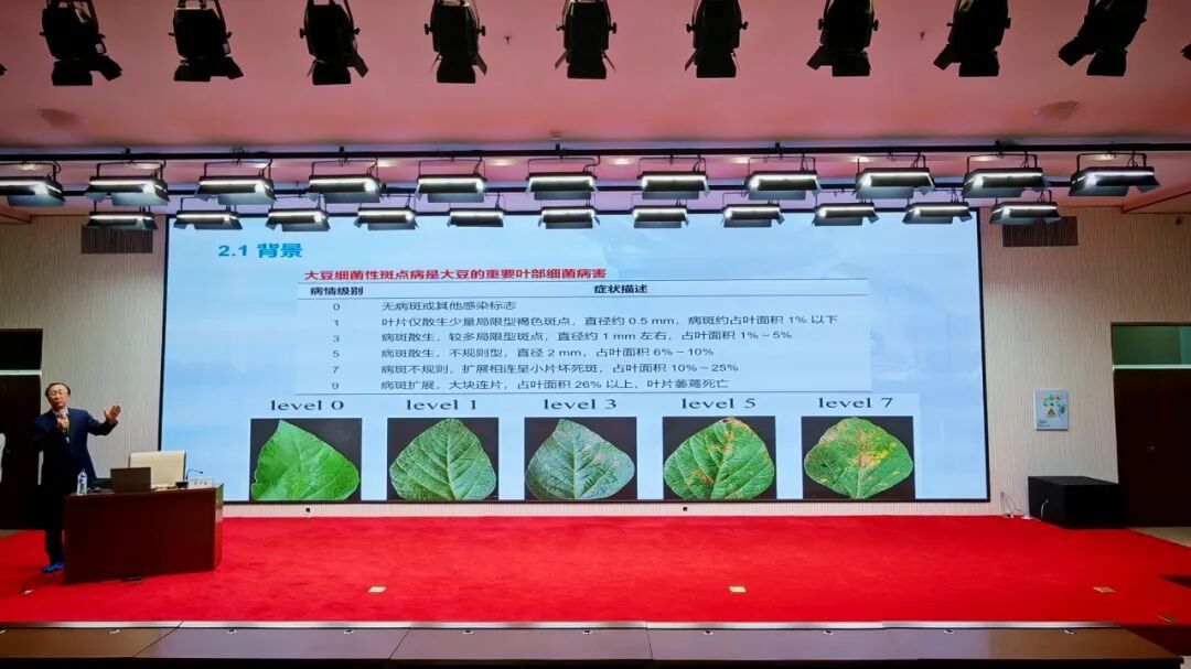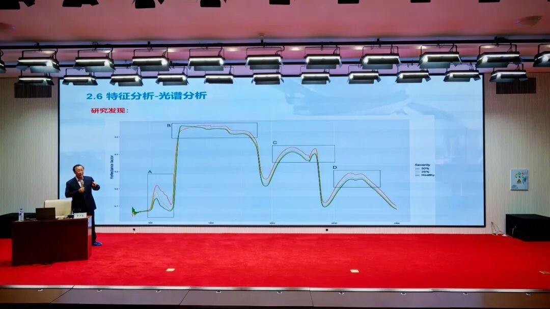 本次报告中,宋少忠教授围绕植物早期叶部病害诊断研究现状、大豆斑点病高光谱特征提取与分析、基于HSI(高光谱成像)和MM(混合模型)的黄瓜霜霉病诊断模型三大核心方向展开深入阐述。