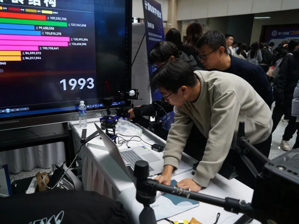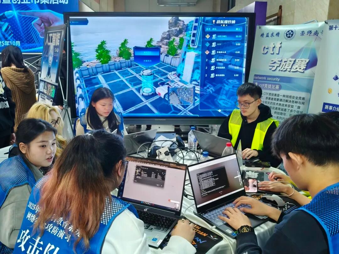 另一侧的CTF夺旗赛现场,队员们身着“网络安全演习”背心,指尖在键盘上跳舞,正在进行一场网络空间安全竞赛,大屏幕上酷炫的赛博风格界面实时刷新着战队排名,代码与策略的较量战况胶着,紧张又刺激!数学与应用教学展区里,学生手持话筒,对着大屏幕上的数据分析图表侃侃而谈,从算法原理到实战案例,把课堂知识活灵活现地展示出来。数据科学与大数据技术专业的同学则秀出了他们的数据可视化获奖作品,让同学们亲眼见证大数据的魔法——那些可视化的数据,让冰冷的数字瞬间变得直观又灵动,仿佛跳起了舞!