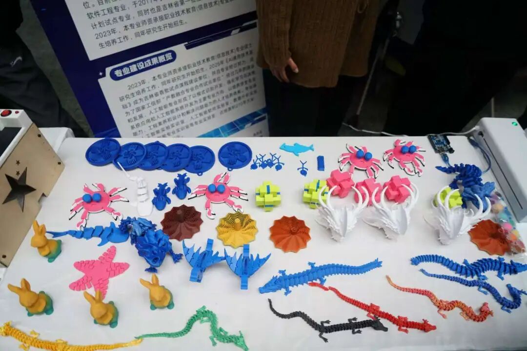 展台上铺满了色彩斑斓的3D打印作品:能折叠的伞状模型、关节超灵活的小恐龙摆件、印着神秘符号的“创意铜钱”,结构复杂的中国龙,还有粉白配色的卡通螃蟹——从建模到打印全是同学们亲手搞定!细腻的纹理加上超有趣的造型,让参观者都忍不住想摸一摸。更棒的是还能玩鲁班锁,同学们纷纷动手挑战拆卸和安装呢!