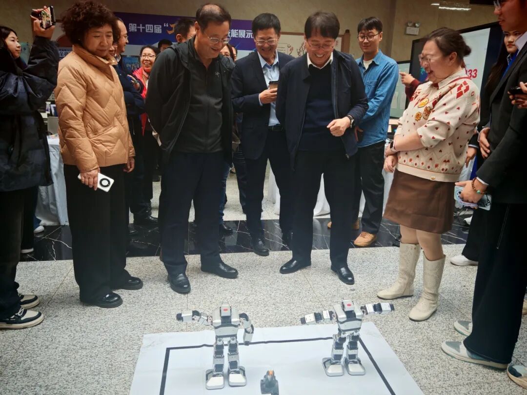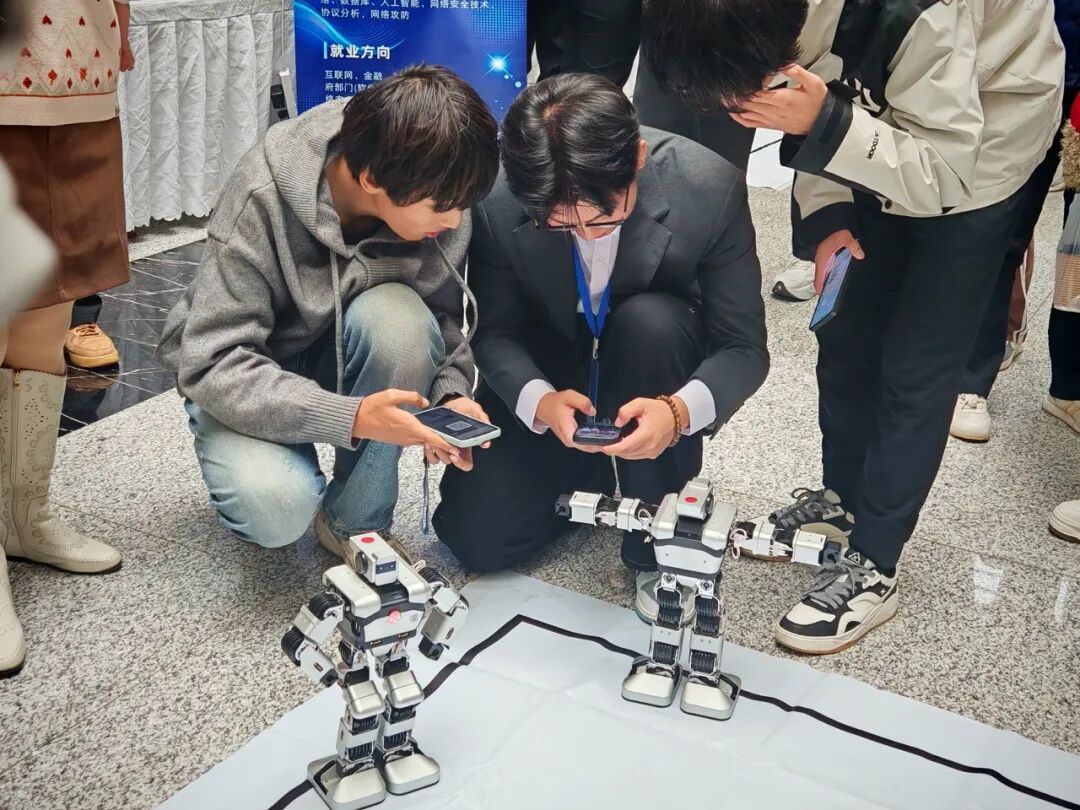 展区中央的白色展示台上,两台双足人形机器人正灵活地随着指令挥手、转身,金属关节咔嚓作响!一旁的变形轮式机器人也酷炫地变身,切换着行进姿态——这些由学生亲手调试的设备,引得围观群众纷纷驻足拍照。当老师和同学们拿起手机抓拍机器人的精彩动作时,调试的学生们兴奋地讲解着代码魔法,科技的严谨范儿和青春的热力在此激情碰撞!